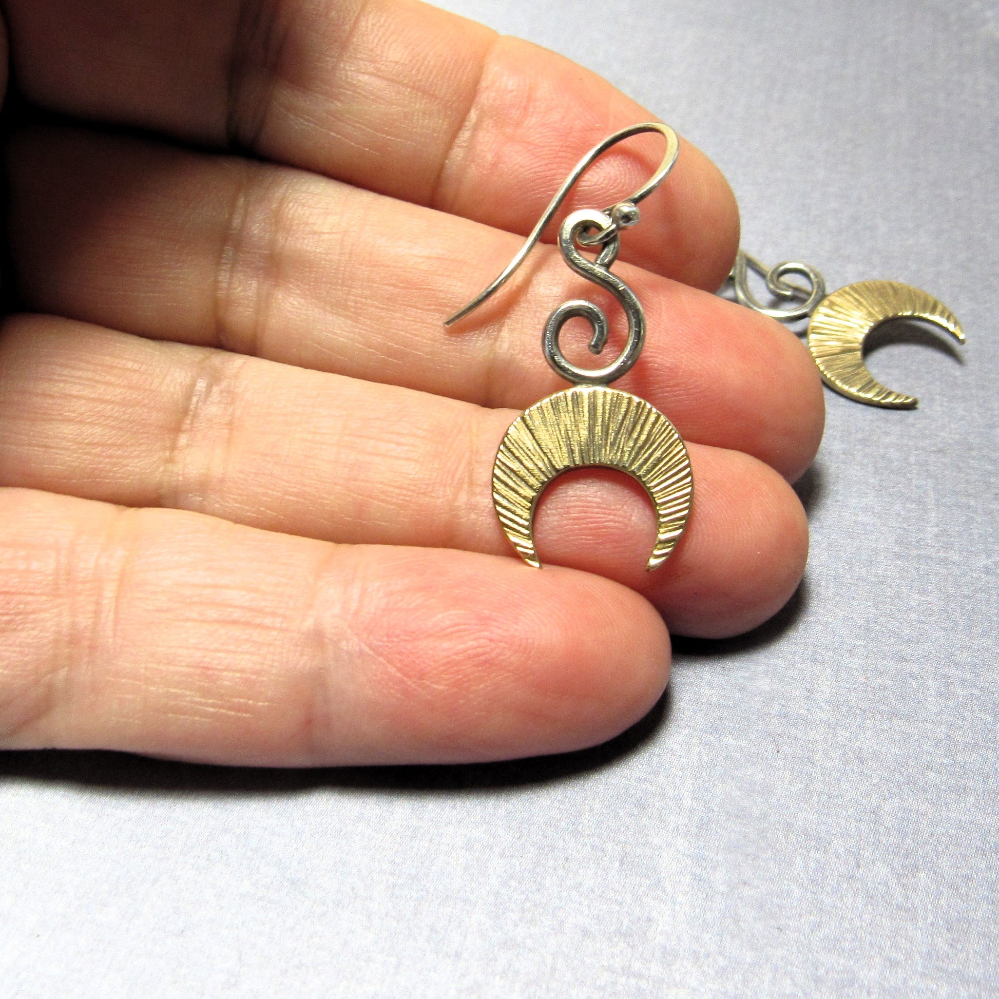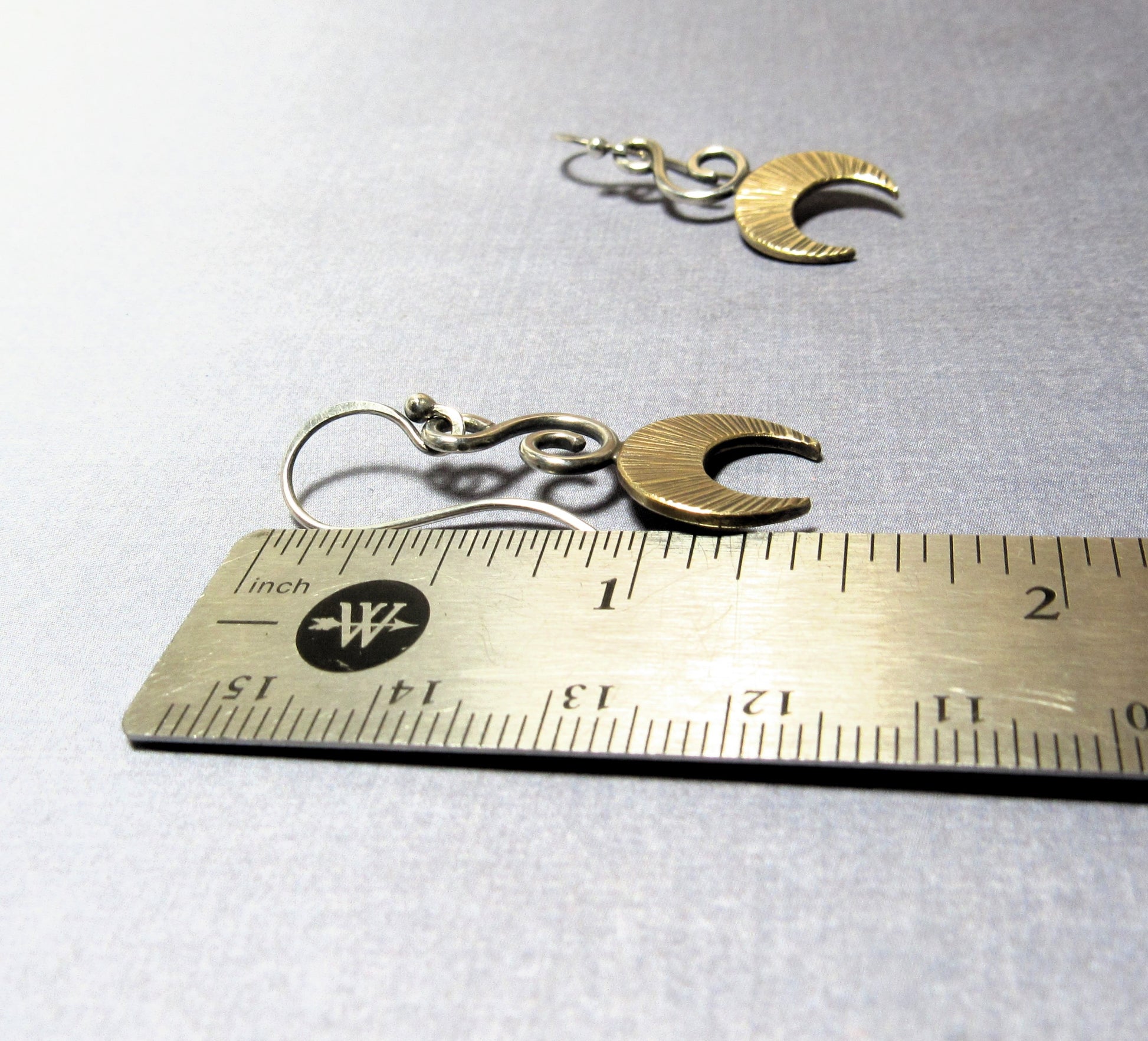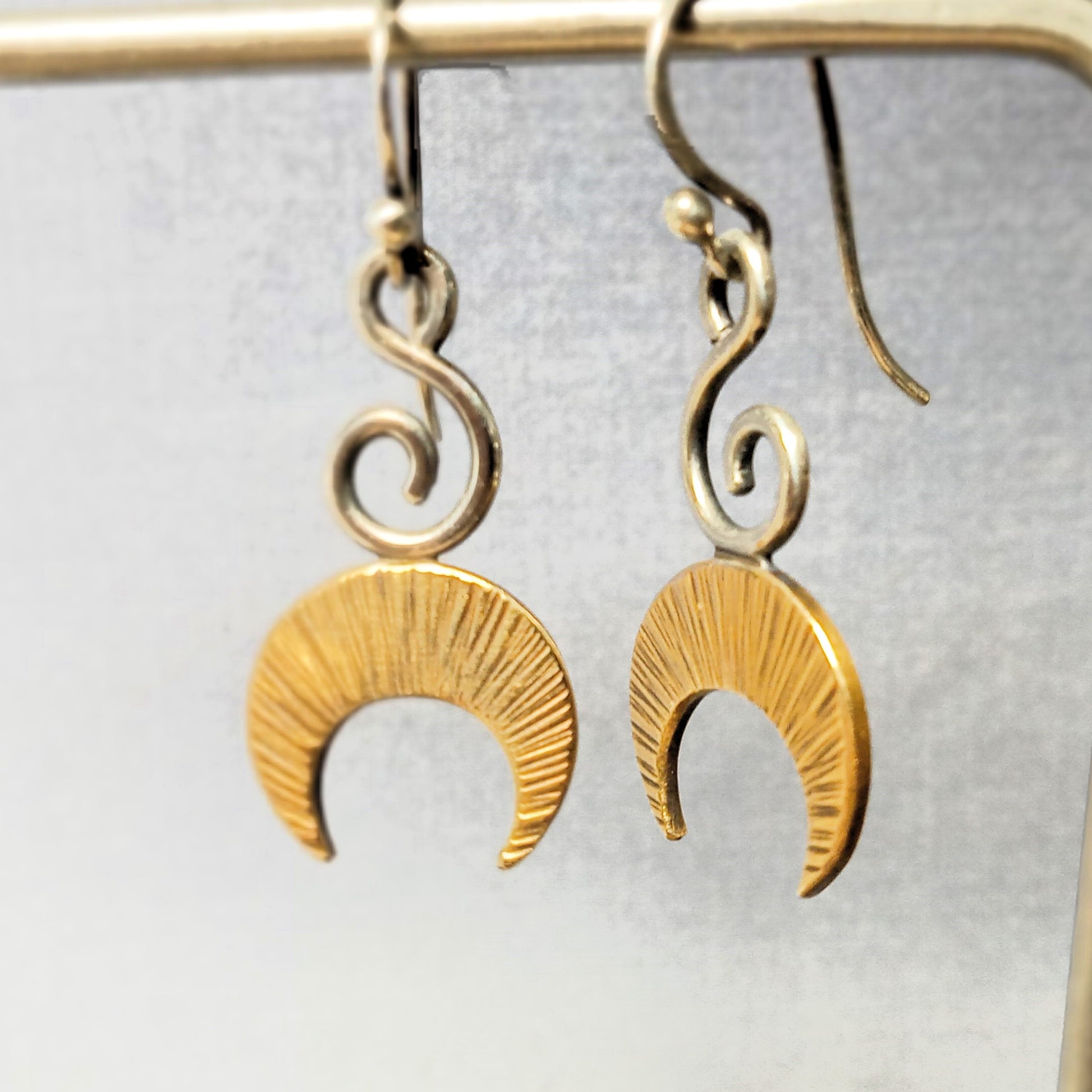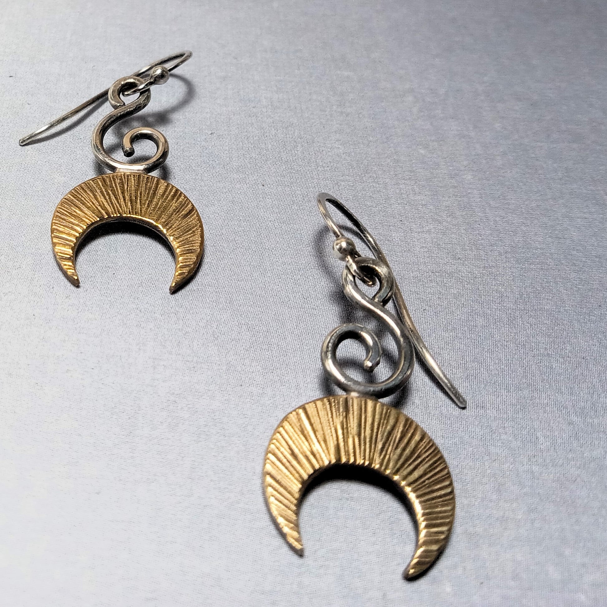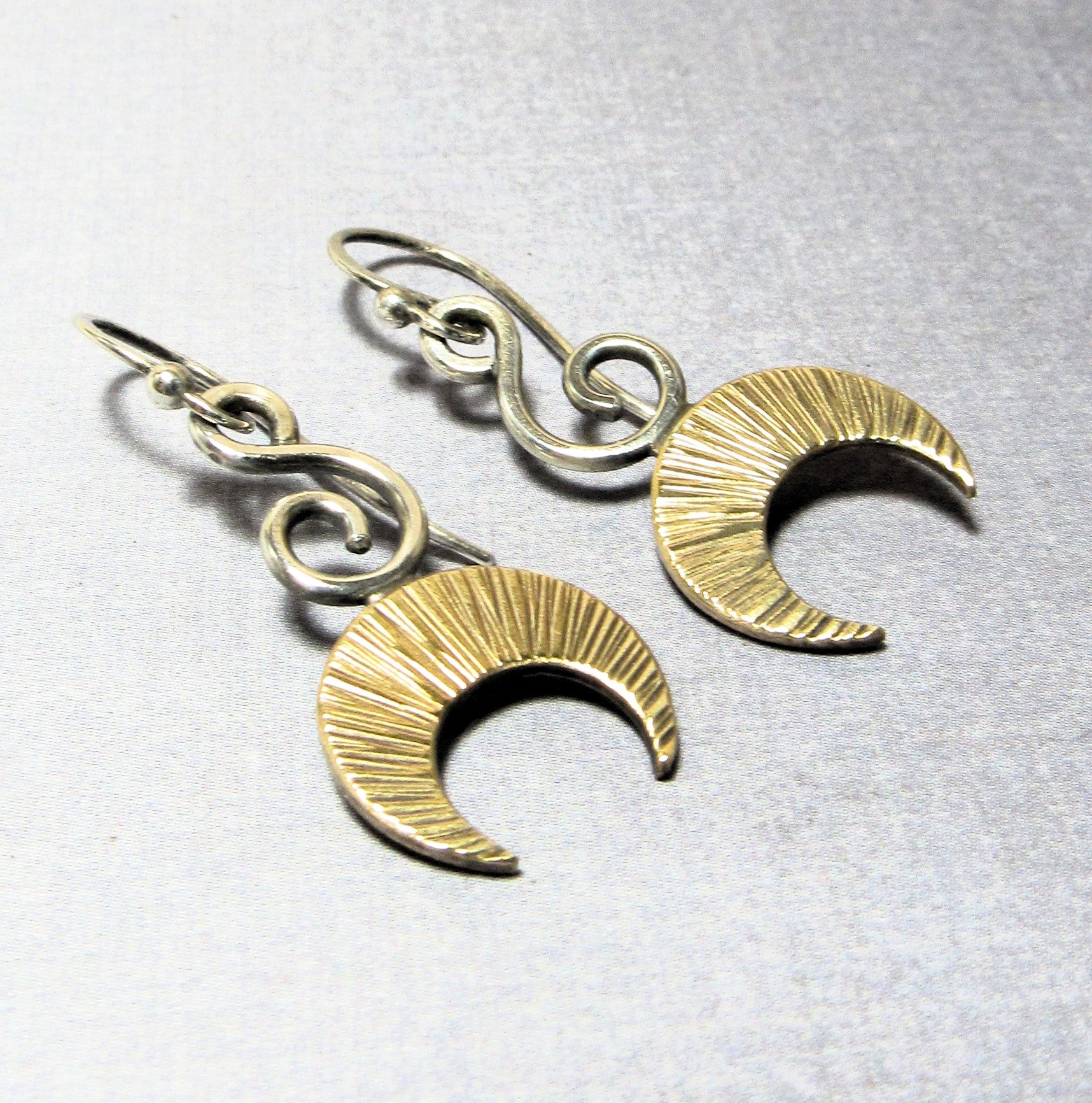 Channel a touch of mystery with these handcrafted downward-facing crescent moon earrings. Each moon is forged from warm bronze, textured with fine rays that catch the light, and suspended from an elegant flourish of Argentium sterling silver.